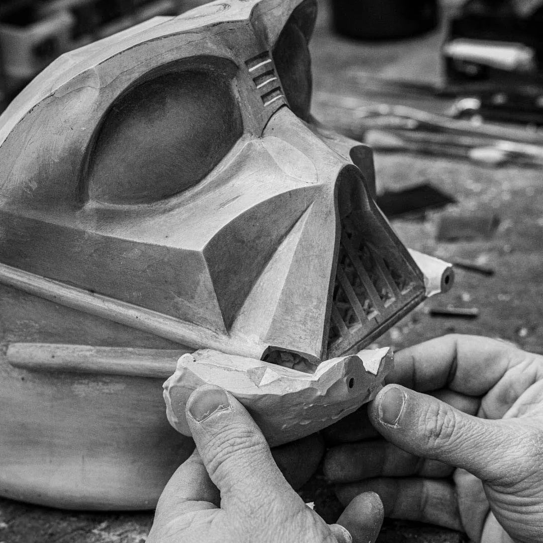 The Darth Vader helmet, an unmistakable icon from the cinematic universe of the Star Wars™ saga, is reinterpreted in porcelain through a detailed technical and decorative process that highlights the character and his singular aesthetic. Crafted in glazed black porcelain, the piece emphasizes the angular lines and striking geometry of the original design.