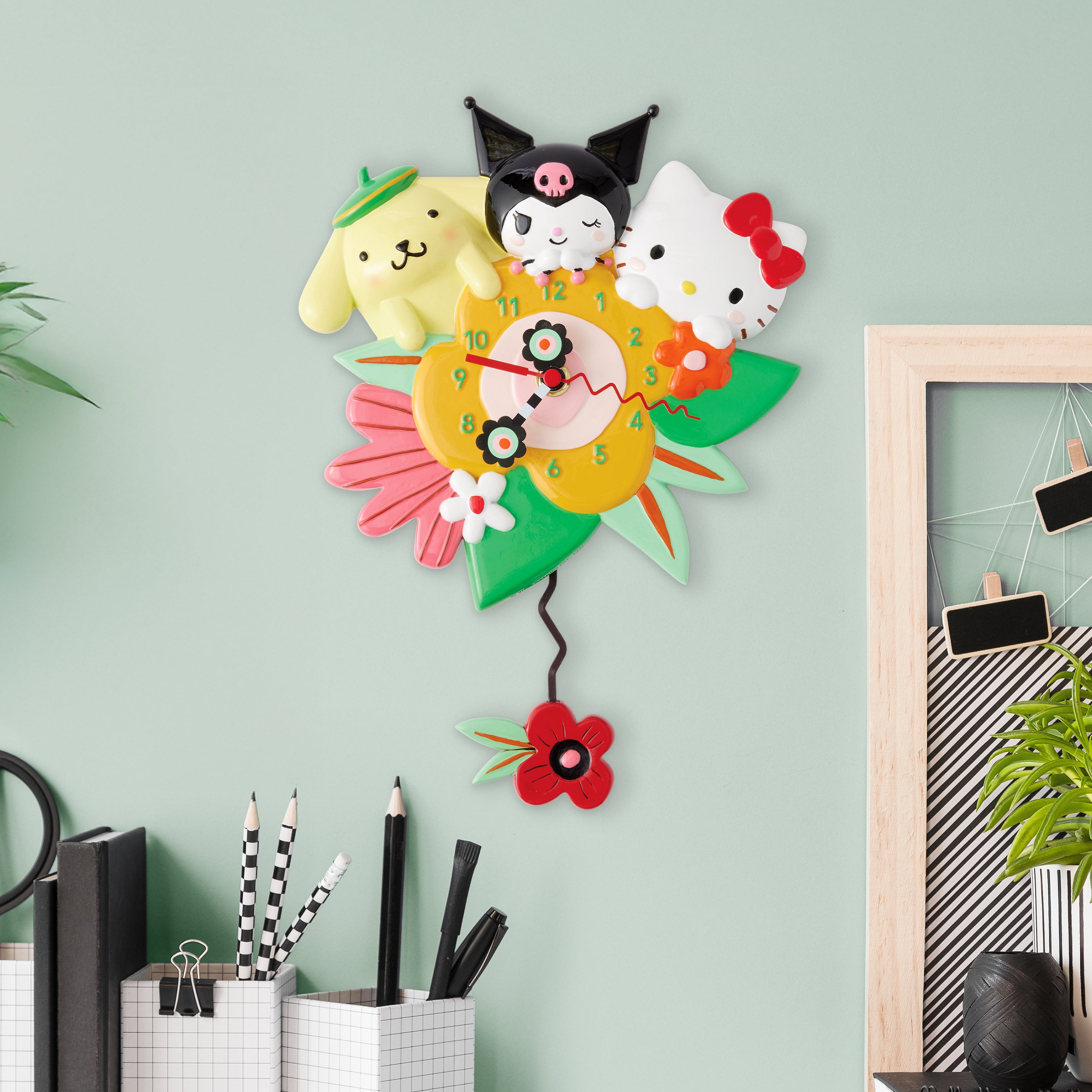 Bring a burst of joy to your space with this vibrant wall clock featuring Hello Kitty, Pompompurin, and Kuromi peeking out from behind a stunning array of colorful flowers. Hello Kitty's iconic charm shines through with cheer and friendship!
