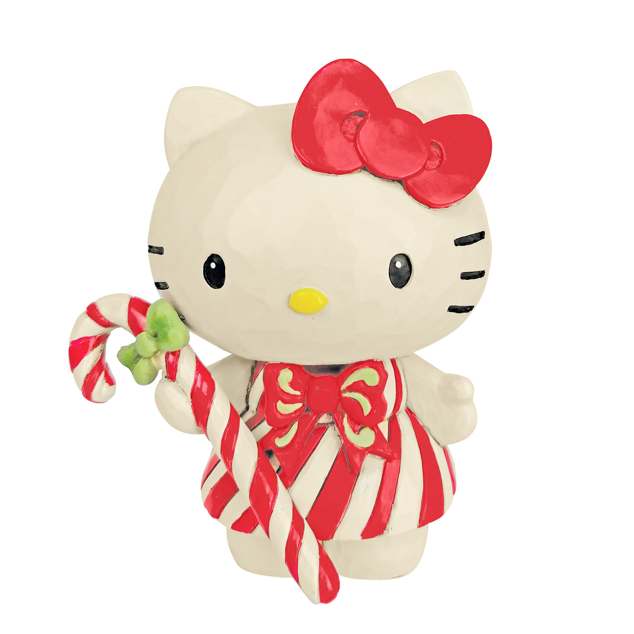 Celebrate the sweetness of the season with this festive Jim Shore design of Hello Kitty in a red and white striped dress which perfectly matches the giant candy cane she holds. With a cheerful expression she's a delightful reminder of holiday joy.