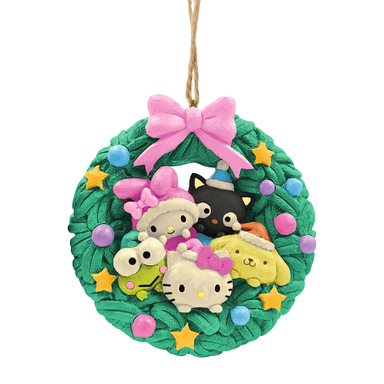 Celebrate the season with this festive Jim Shore ornament of Hello Kitty and her friends, all wearing Santa hats and framed within a beautifully decorated Christmas wreath. Jim Shore's signature folk details bring a heartwarming charm to your tree.