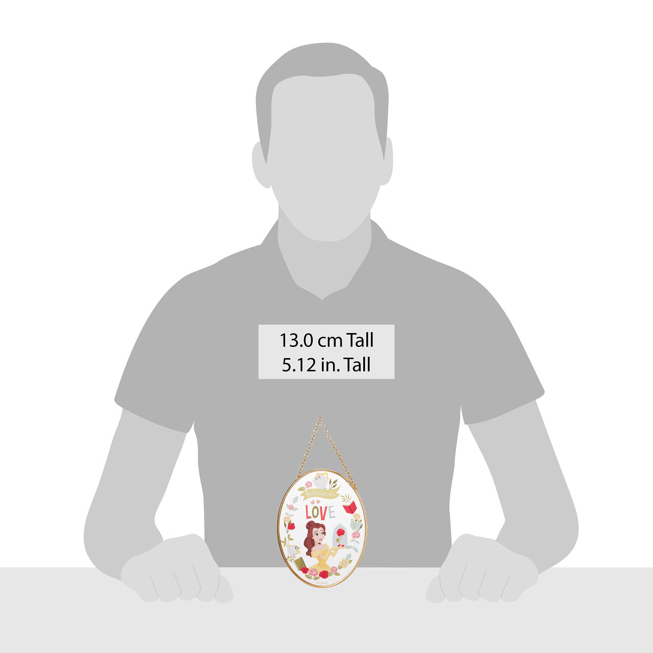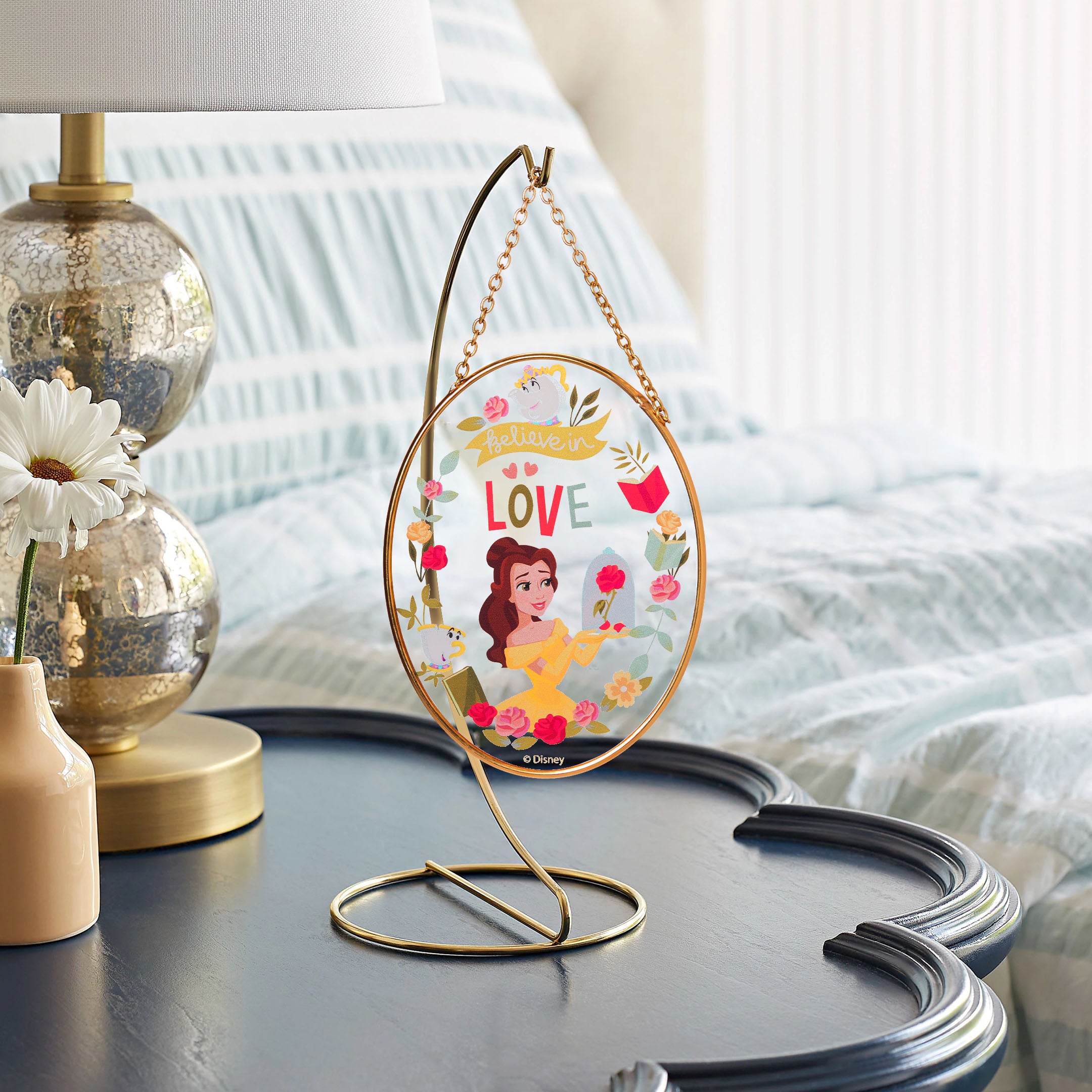 The Disney Garden Collection offers colorful suncatchers featuring your favorite Disney characters in fun and colorful designs. Belle from Beauty and the Beast poses in her gold formal gown while holding the red rose, outlined in flowers and books, inscribed with "believe in love."