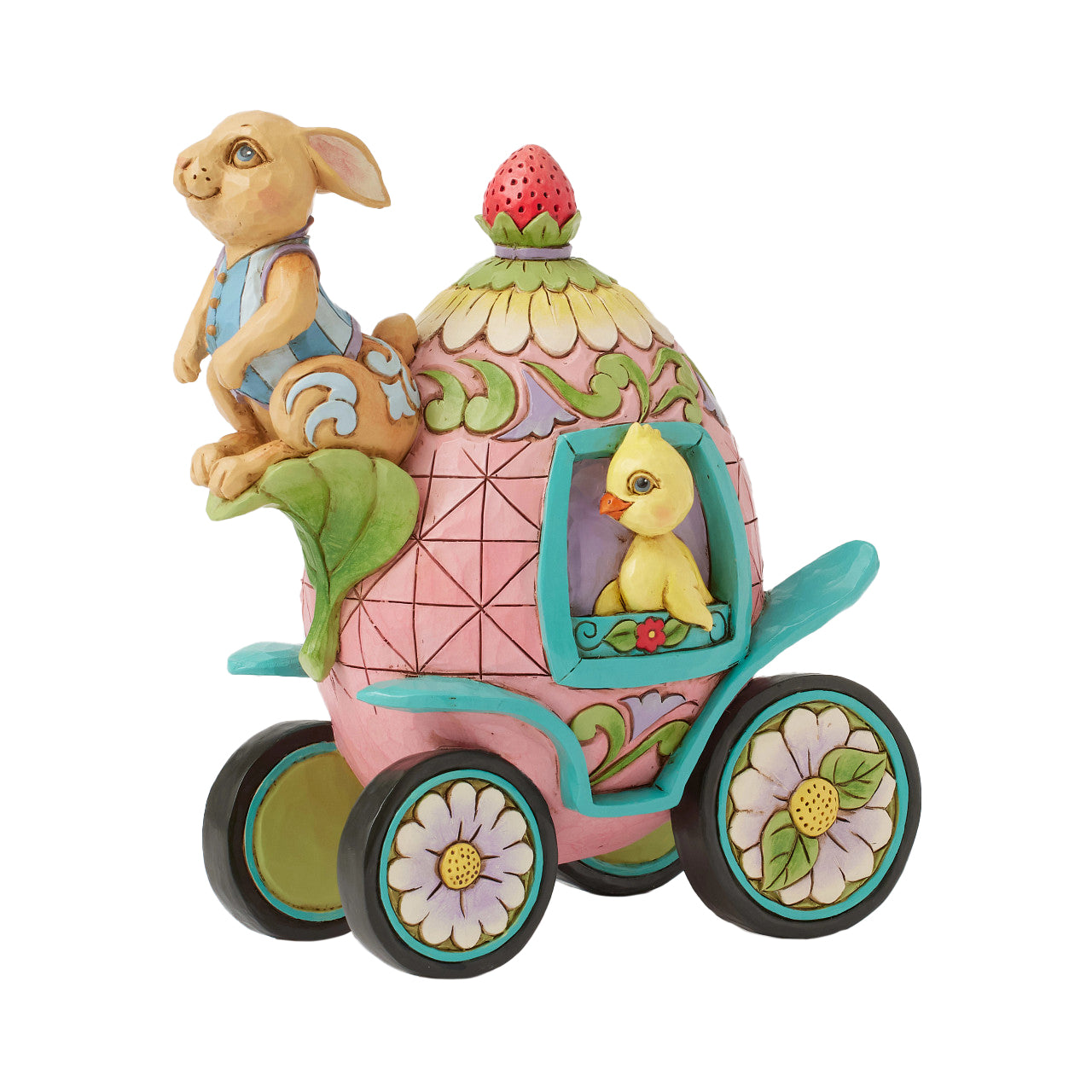 A 2nd annual design joins the Easter Parade series. Bringing Easter wishes a bunny coachman on his box seat guides his chick passenger your way. Jim Shore's masterful use of color brings the handcrafted piece to life, hand-painted in exquisite detail