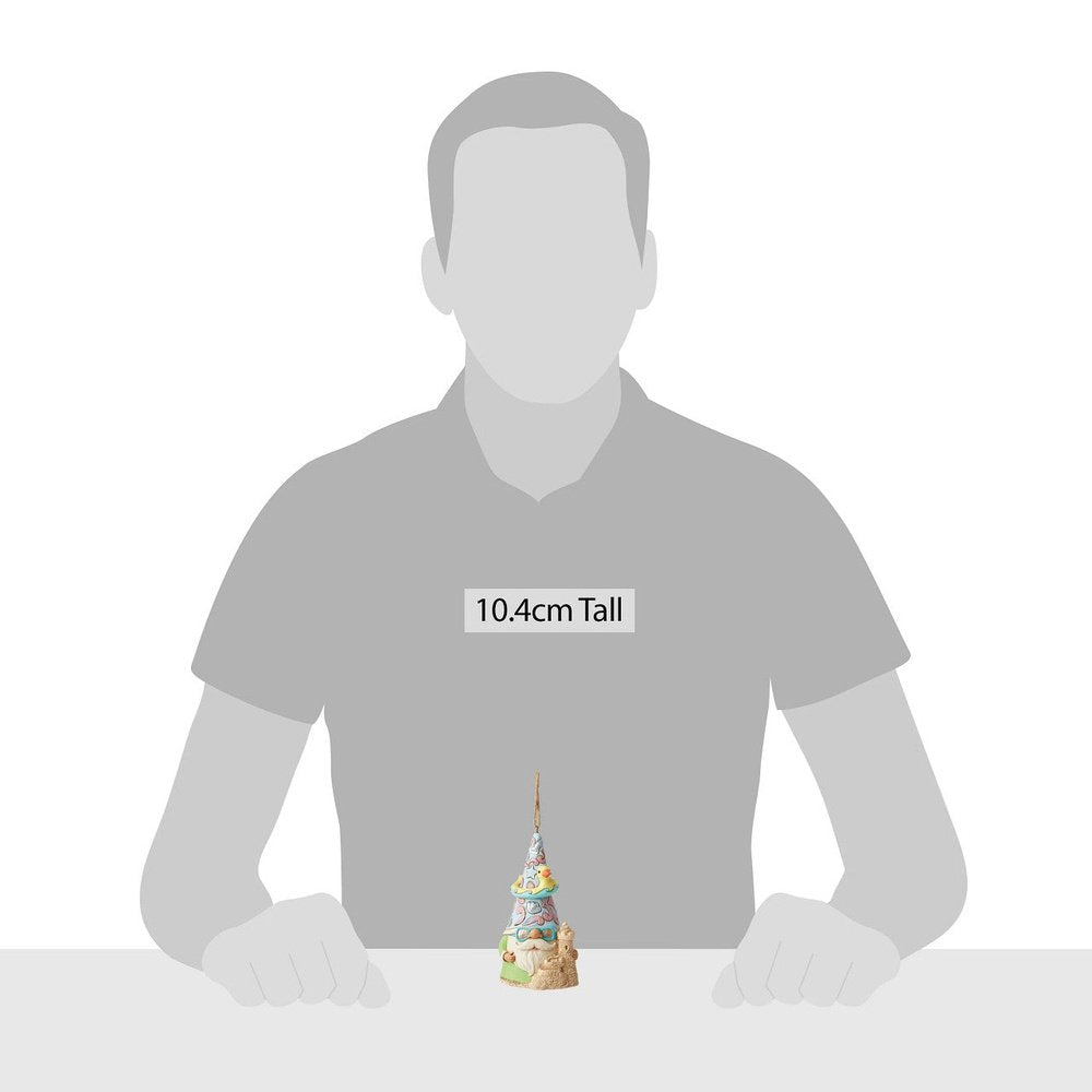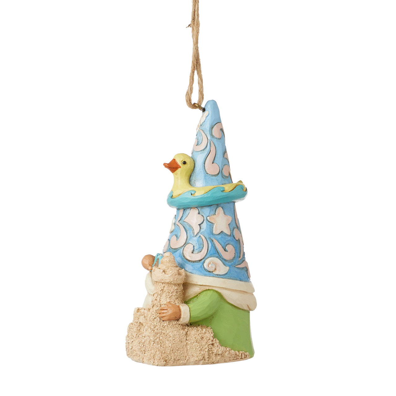 Building a sandcastle, this cheerful coastal gnome ornament is a masterpiece of seaside charm. He wears sunglasses and a hat patterned in shells and rosemaling. A duckie floatie sits atop the gnome's hat with playful poise.