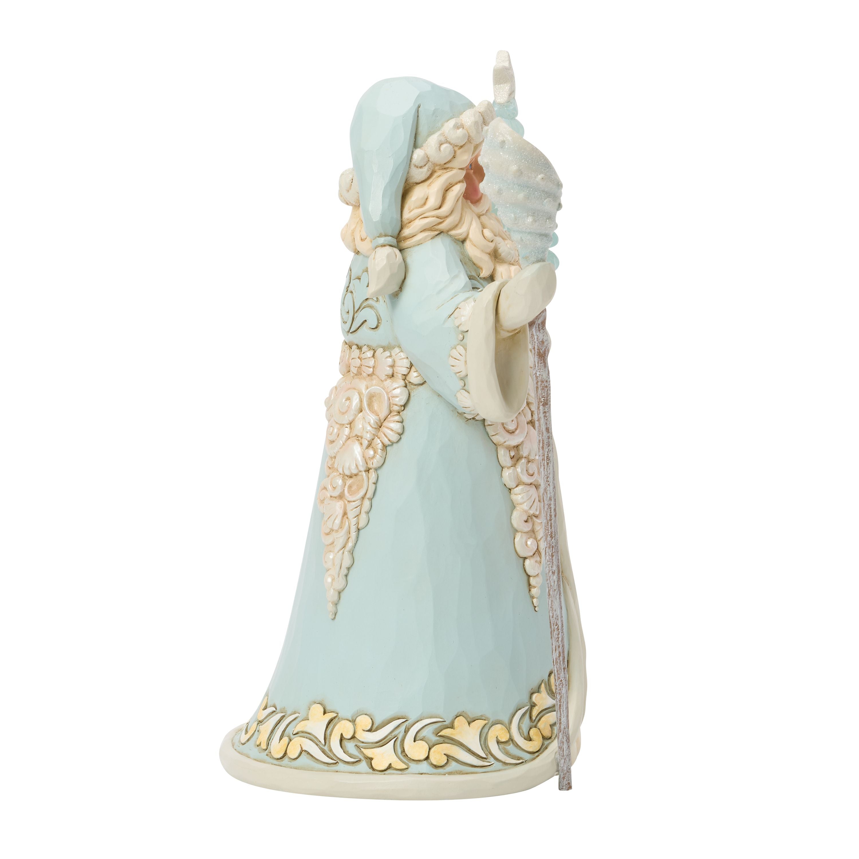 Dressed in a coastal blue robe, Santa is completely adorned with the treasures of the sea. Shells trim his hat, cloak, and sleeves, while a shell belt cinches his waist. Carrying a conch staff and a sea glass tree, he brings sea cheer to Christmas.