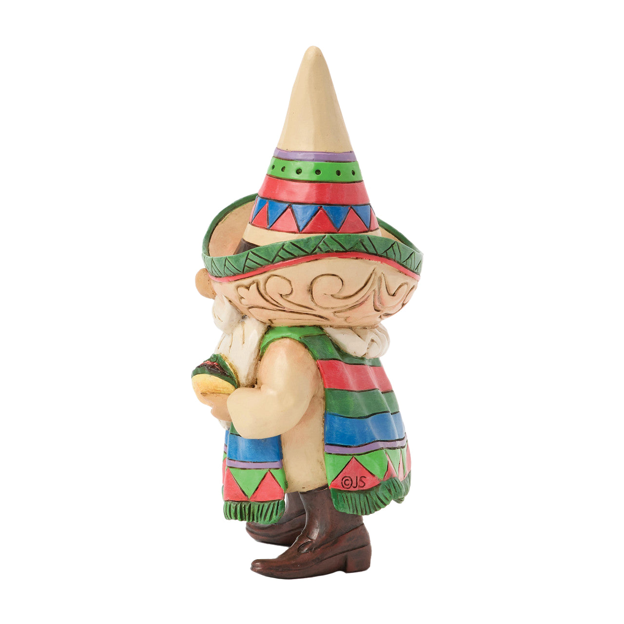 No one knows gnomes quite like Jim Shore! This lively Jim Shore gnome is ready for the next fiesta, dressed in an intricate sombrero, colorful serape, and cowboy boots. Enjoying a taco with extra hot sauce, he's all set for a spicy celebration!