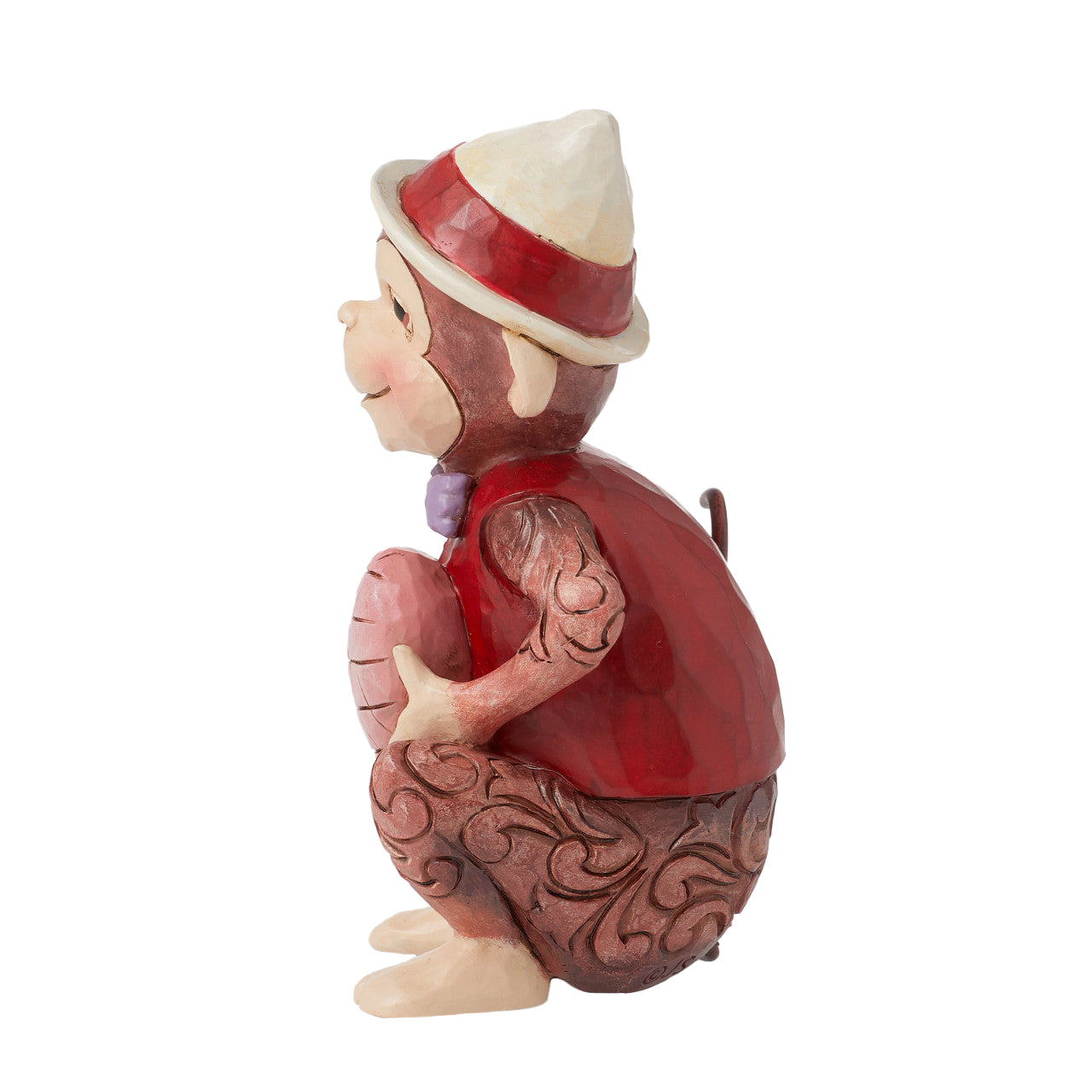 Brighten your day with this delightful Jim Shore figurine showcasing a cheerful monkey who is so sporty wearing a hat, bowtie, and vest. His infectious smile beams as he carries a patchwork heart. With rosemaling on his fur, this charming piece exudes with energy.