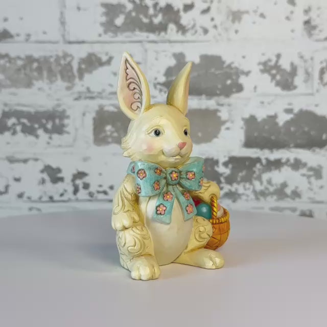 Celebrate the joys of Easter with this delightful Jim Shore figurine featuring an adorable bunny adorned in vibrant purple rosemaling. The sweet bunny wears a charming flower bow and carries a basket bursting with intricately painted Easter eggs.