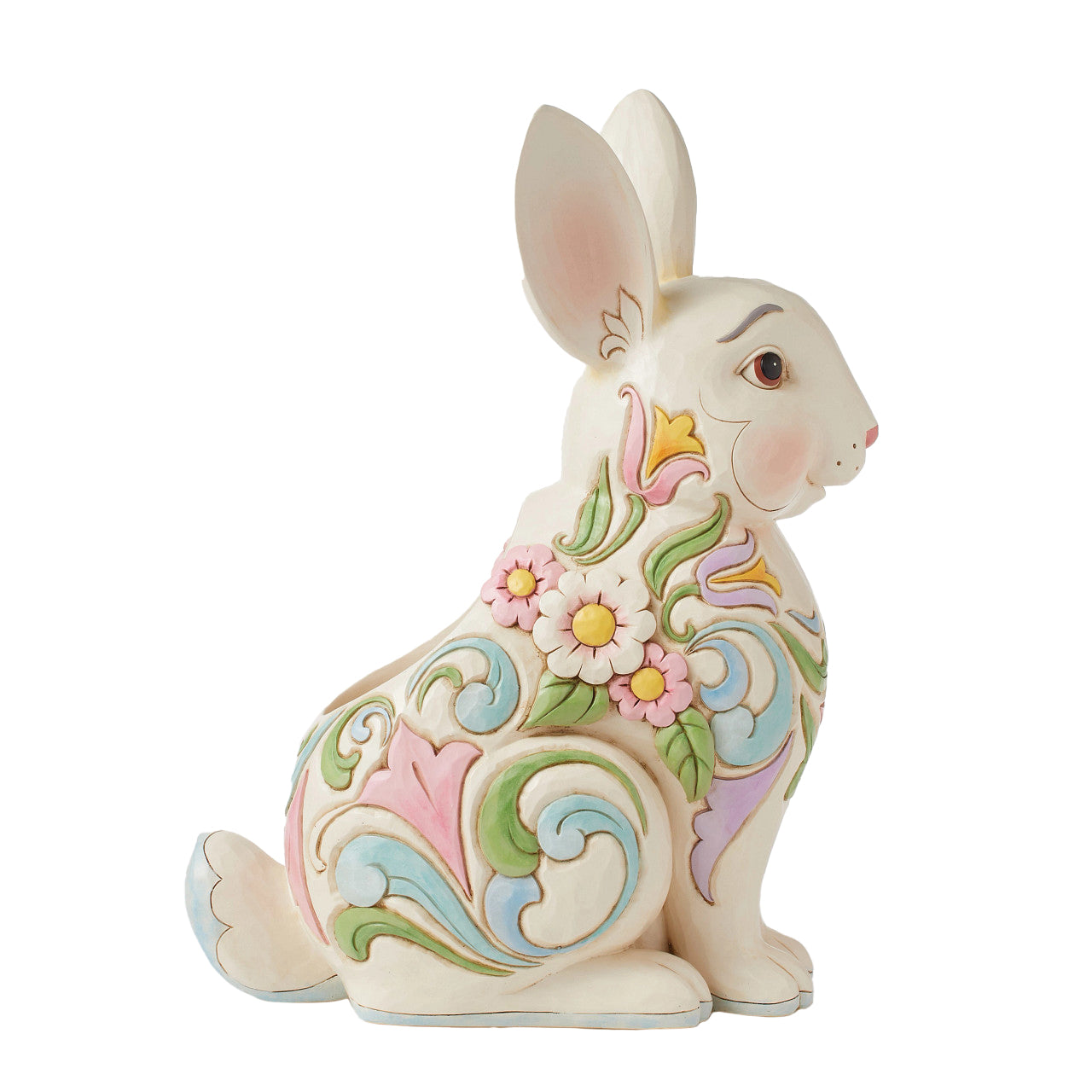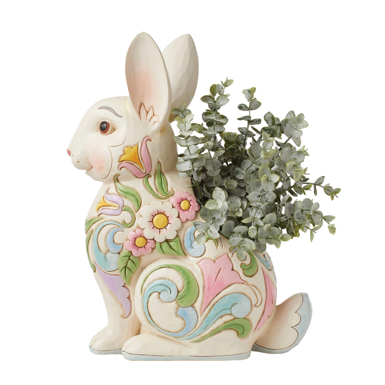 This cheerful bunny planter is ready for Easter! Colorful blue and purple rosemaling design on his fur, this fluffy Jim Shore rabbit is a delightful edition to your springtime home decor.