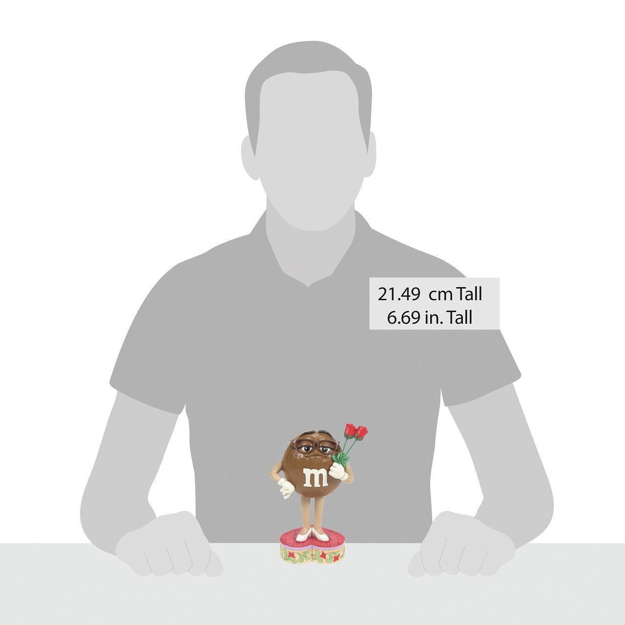 In this Jim Shore design, the sophisticated Brown exudes confidence, standing tall in her signature glasses and stylish white heels, holding two red roses with poise. A heart-shaped stage captures the essence of Valentine's Day.