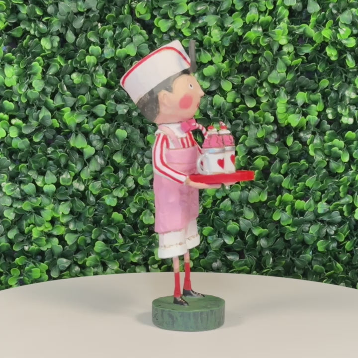 Serving up a large scoop of love, this server carries two desert mugs to a lovely couple on their Valentine's date. Wearing a pink apron with red striped shirt and matching soda jerk serving cap, he is busy tonight with the mad rush.