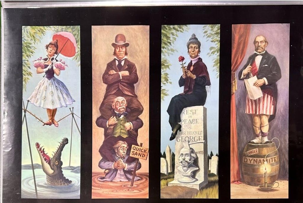 I got this and the other one with the girl on the tight rope with the alligator below. I have the Alice in Wonderland where she is opening the little door. There is a light in the doorway you can turn on or off. I also have the hitchhiking ghosts that also has a light on it which adds a cool effect. I wish that had some of the other posters that get longer in the room in the actual Haunted House.......There were the guys that were in QuickSand and they were all piggybacking on each other like a totem pole. The last one was a business looking guy that was in his striped underwear. Those would be cool items I would buy. HINT HINT