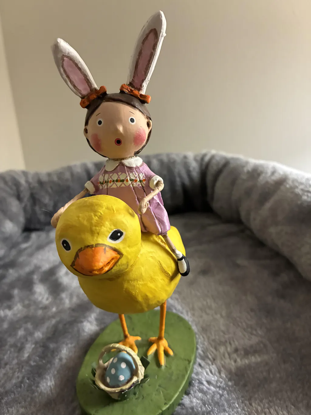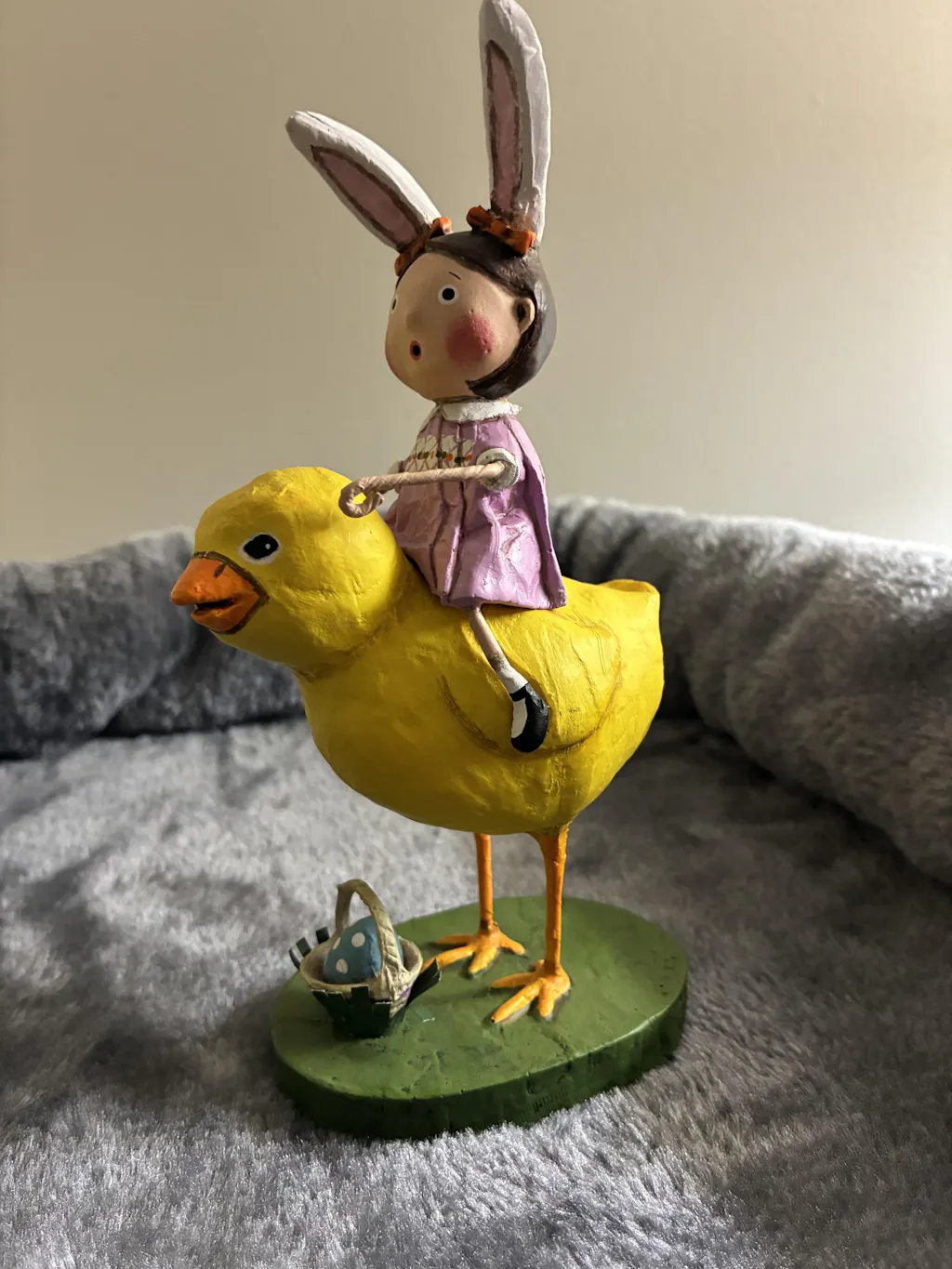 I just opened the package the other day. The first thing I saw was a pair of Bunny ears. Natural headdress for the little girl, wearing pink, who was riding a large yellow Easter chick. They are cute together and, although I hadn’t thought of a chick as transportation , this one serves quite well. This is a lovely figure for Easter.