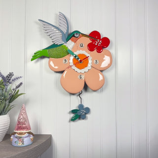 Hummingbird Resin Clock with flower pendulum, hands and battery mechanism. requires one AA Battery not included.
