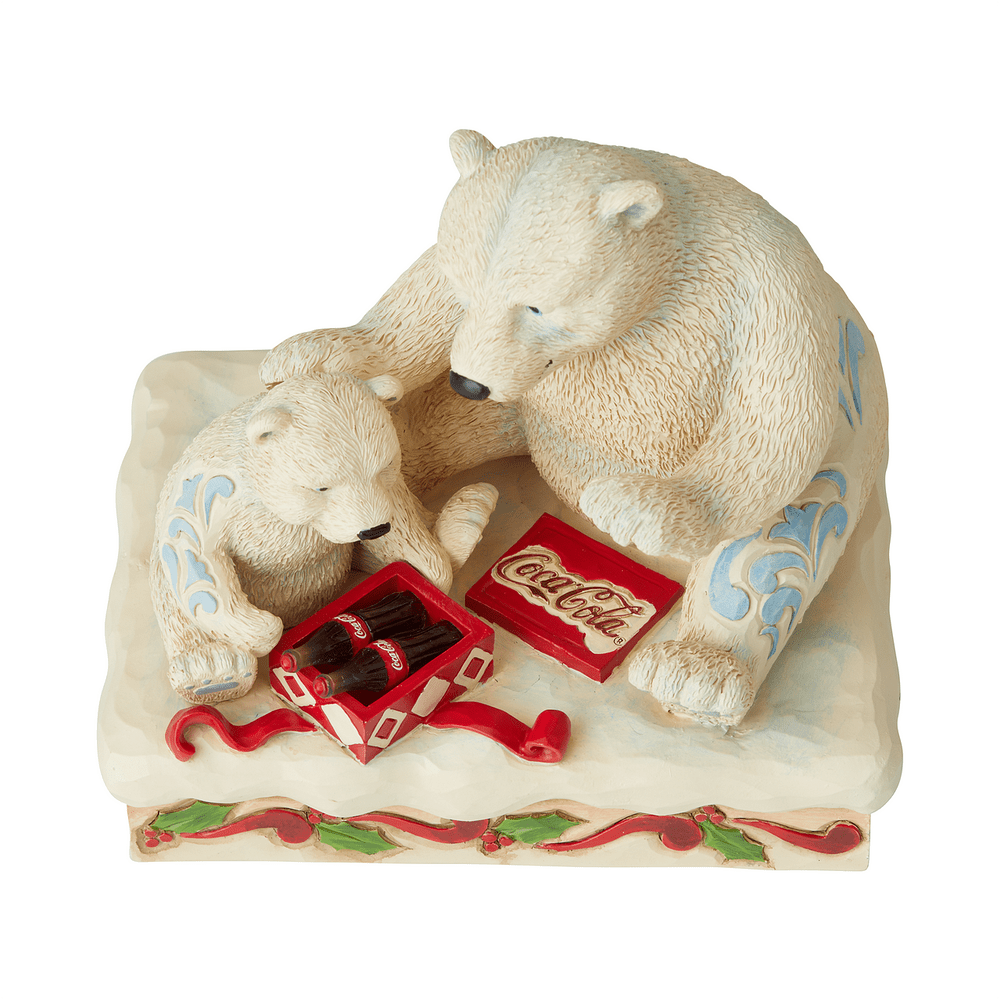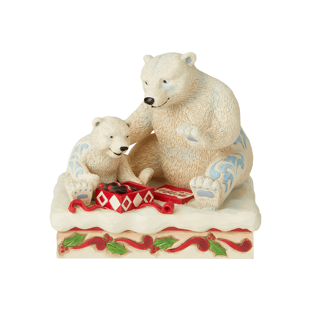 Jim shore's Coca Cola designs are iconic images drawn from classic advertising campaigns. This heartwarming scene of a polar bear cub opening a special gift from his momma bear showcases Jim's unique combination of rich artistry and handcrafted attention to detail.