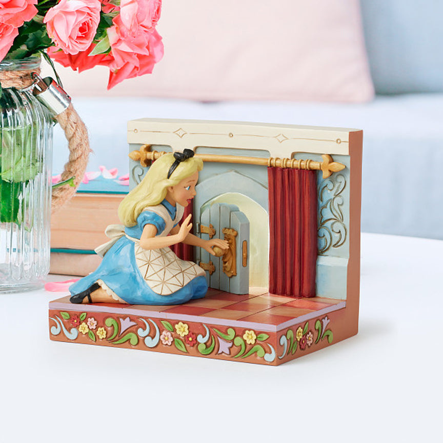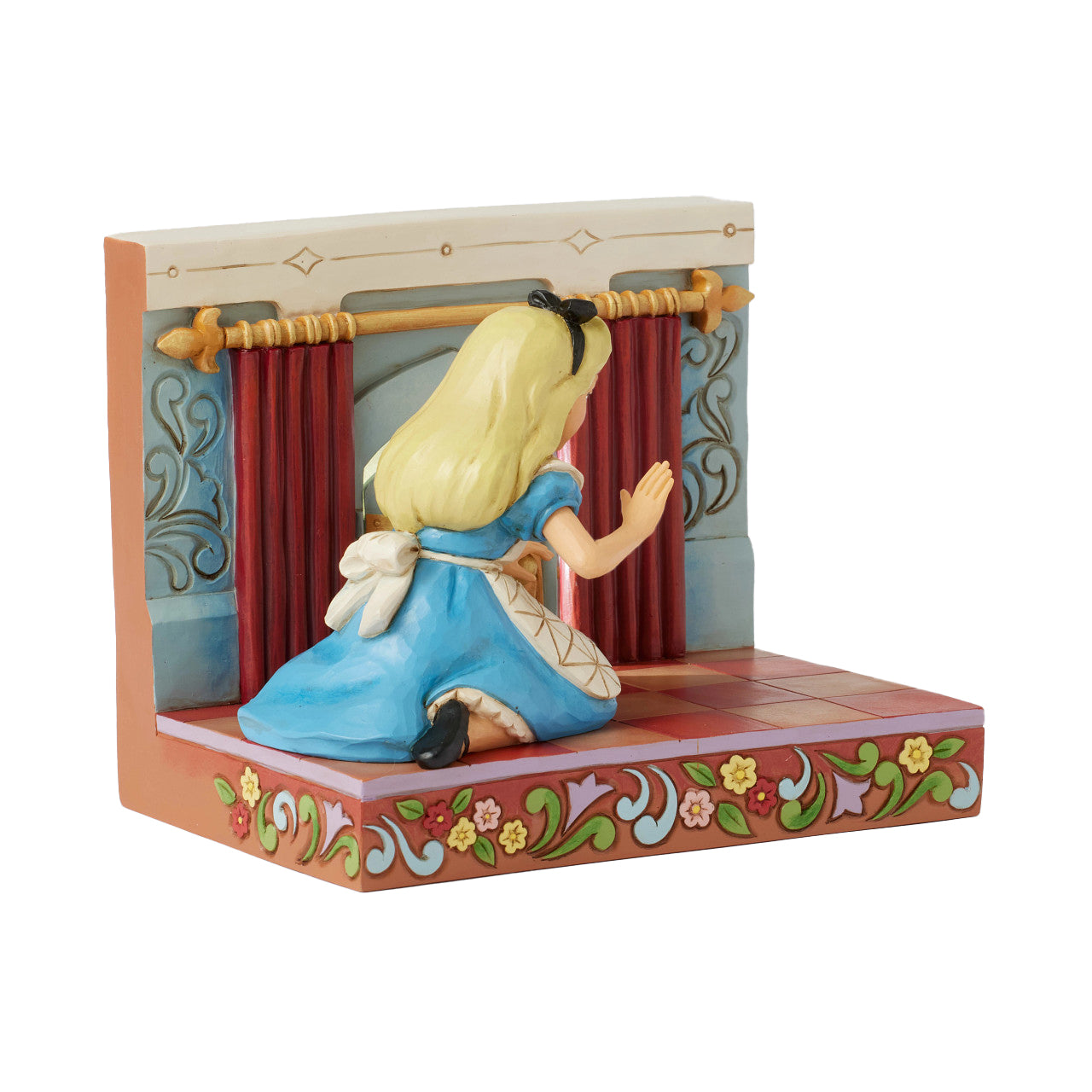 Alice eagerly opens the door to Wonderland, twisting the smiling doorknob while the curtains draw back to reveal the enchanting realm beyond. With inviting LED lights, this captivating Jim Shore scene captures the curiosity of Alice's adventure.
