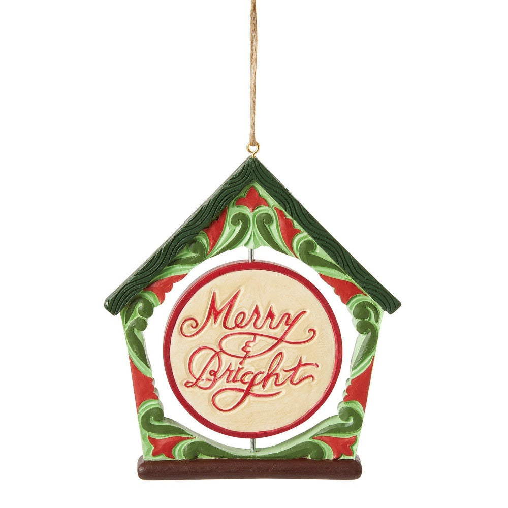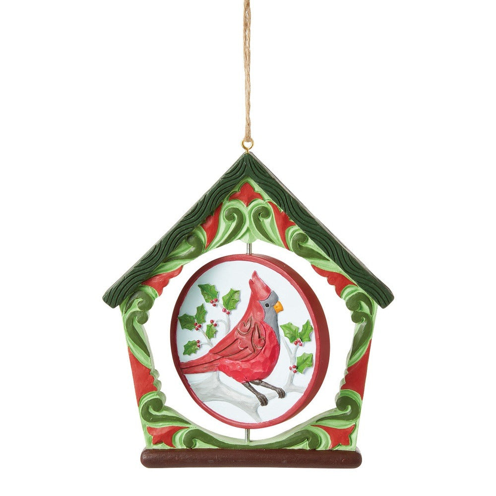 This birdhouse shaped promotionally priced ornament is a beautiful addition to your holiday tree. With a red and green rosemaling frame, a peaceful rotating cardinal rests on a flowered branch with decorated wings.