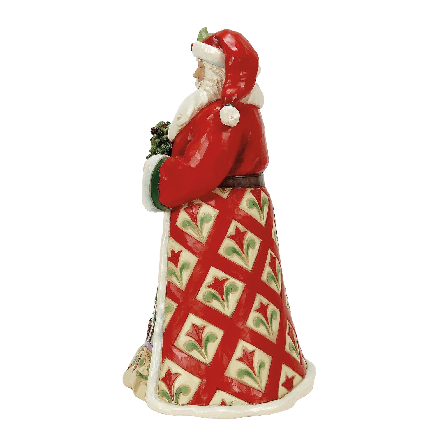 Christmas at the Lodge by Jim Shore designed a Santa holding a festive wreath, ready to spread holiday cheer. His intricately decorated cloak, patterned with red flowers, parts to reveal a winter lodge scene, complete with mountains and Adirondack chairs.
