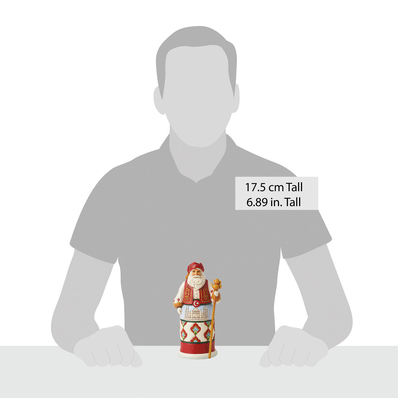 Jim Shore's Christmas Around the World collection celebrates tradition and culture. Incorporating each country's unique customs, Turkish Santa wears traditional robes with famous architecture, a red turban, and holds a golden tea kettle staff.