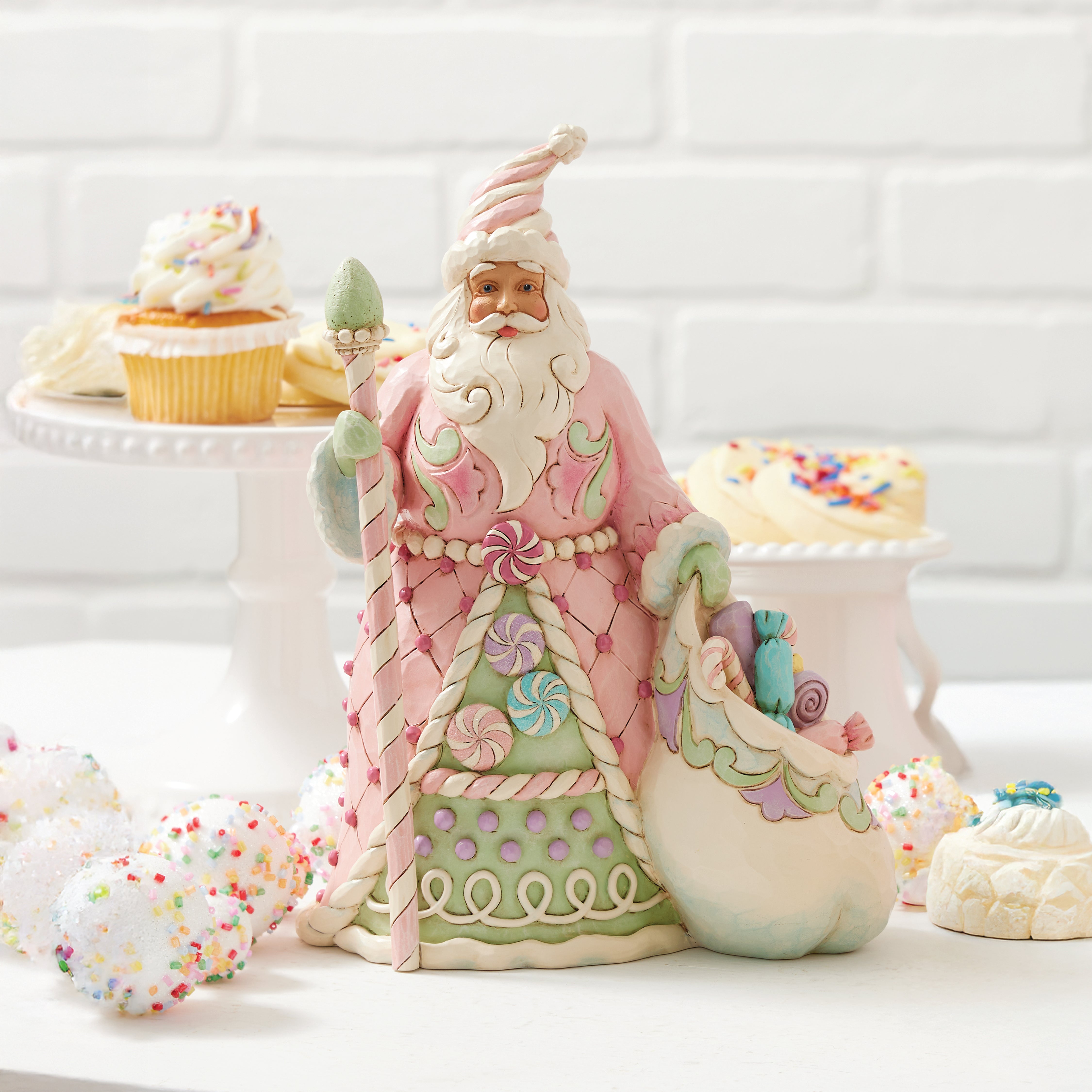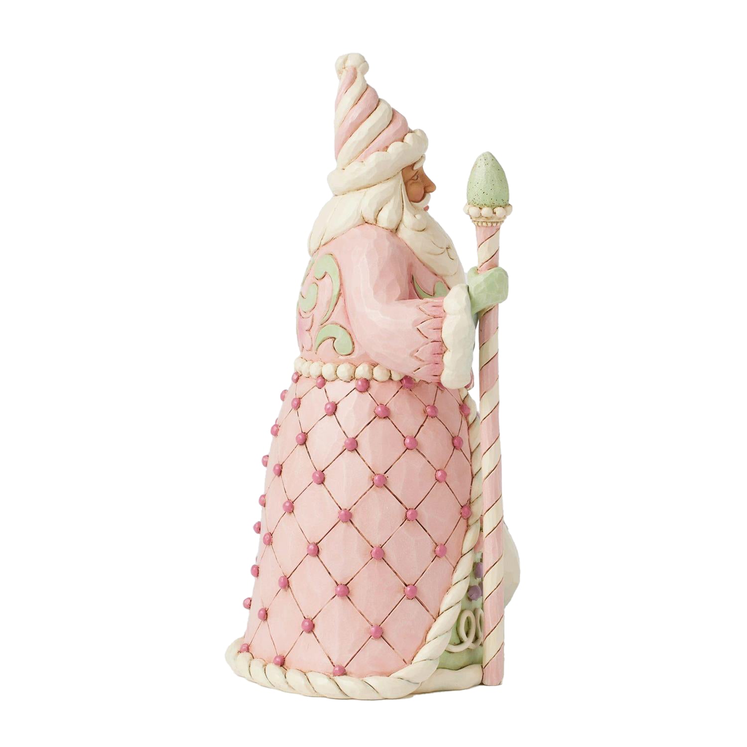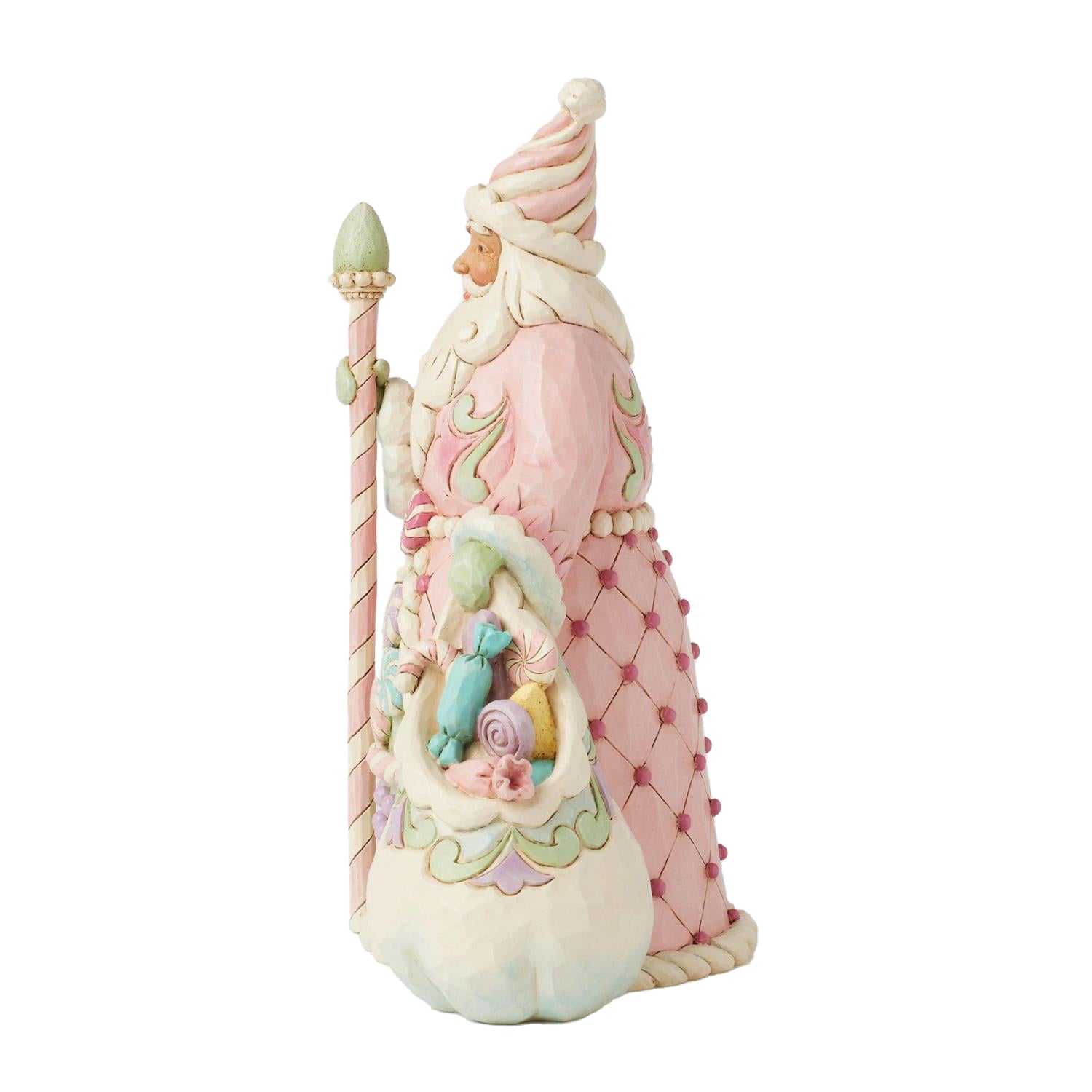 This adorable Heartwood Sweets Santa designed by Jim Shore is dressed in delightful pastel pinks and greens, adorned with whimsical sugar plum candies. Carrying a staff and a bag of sweets, his hat resembles twisted icing, while his cloak is patterned with hard candy and icing.