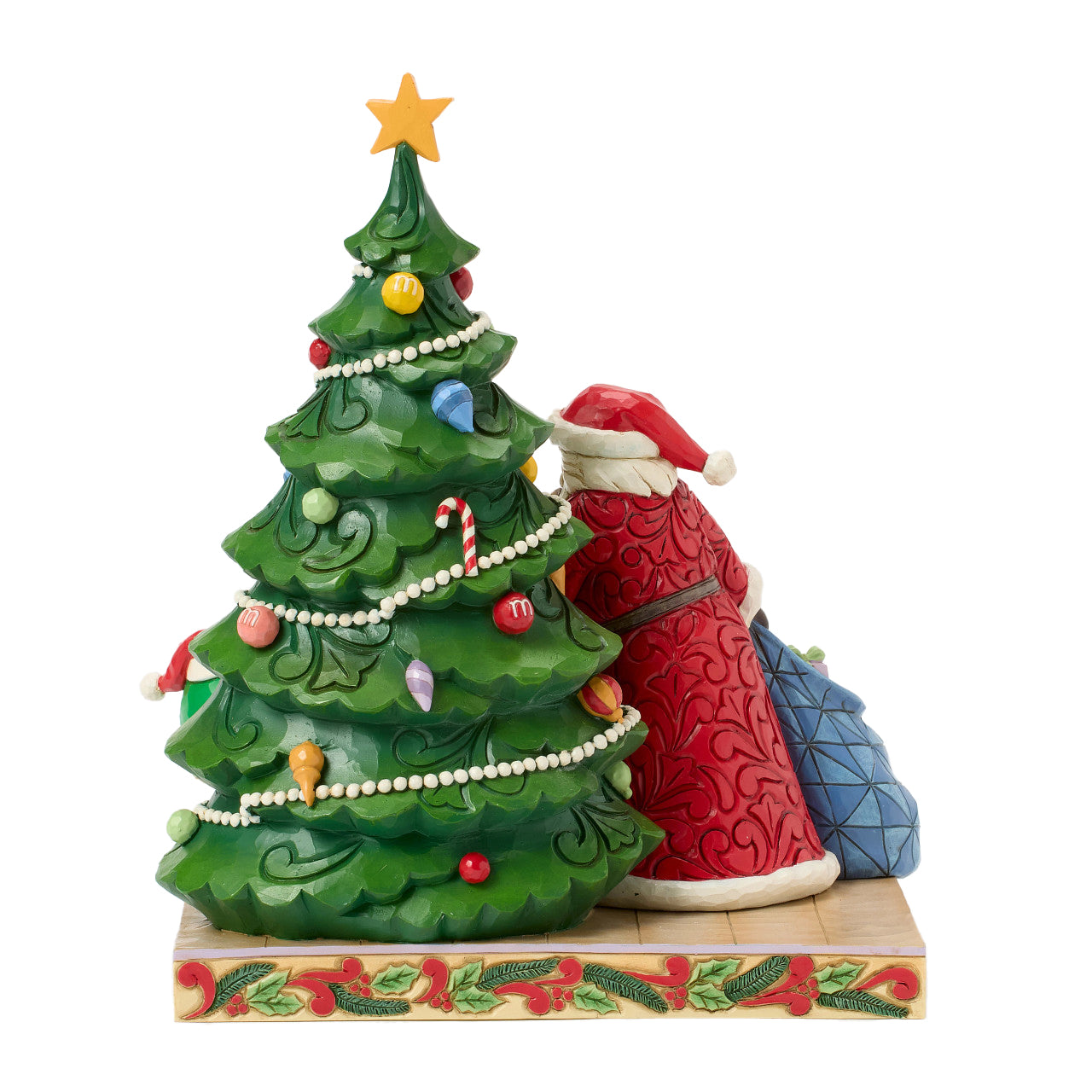 Celebrate Christmas Eve with this enchanting Jim Shore design featuring Santa putting a finger to his lips. He urges M&M's Green and Yellow Characters to keep quiet as he places gifts under a festive M&M-themed Christmas tree.