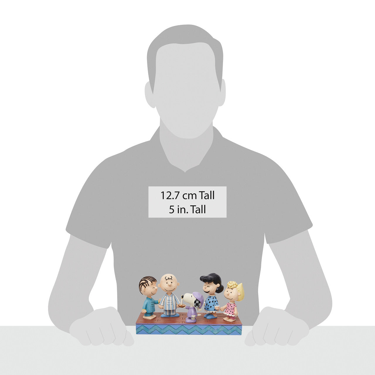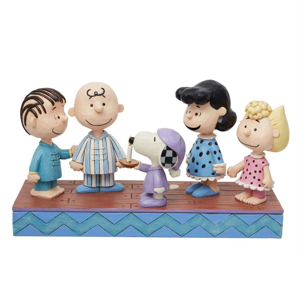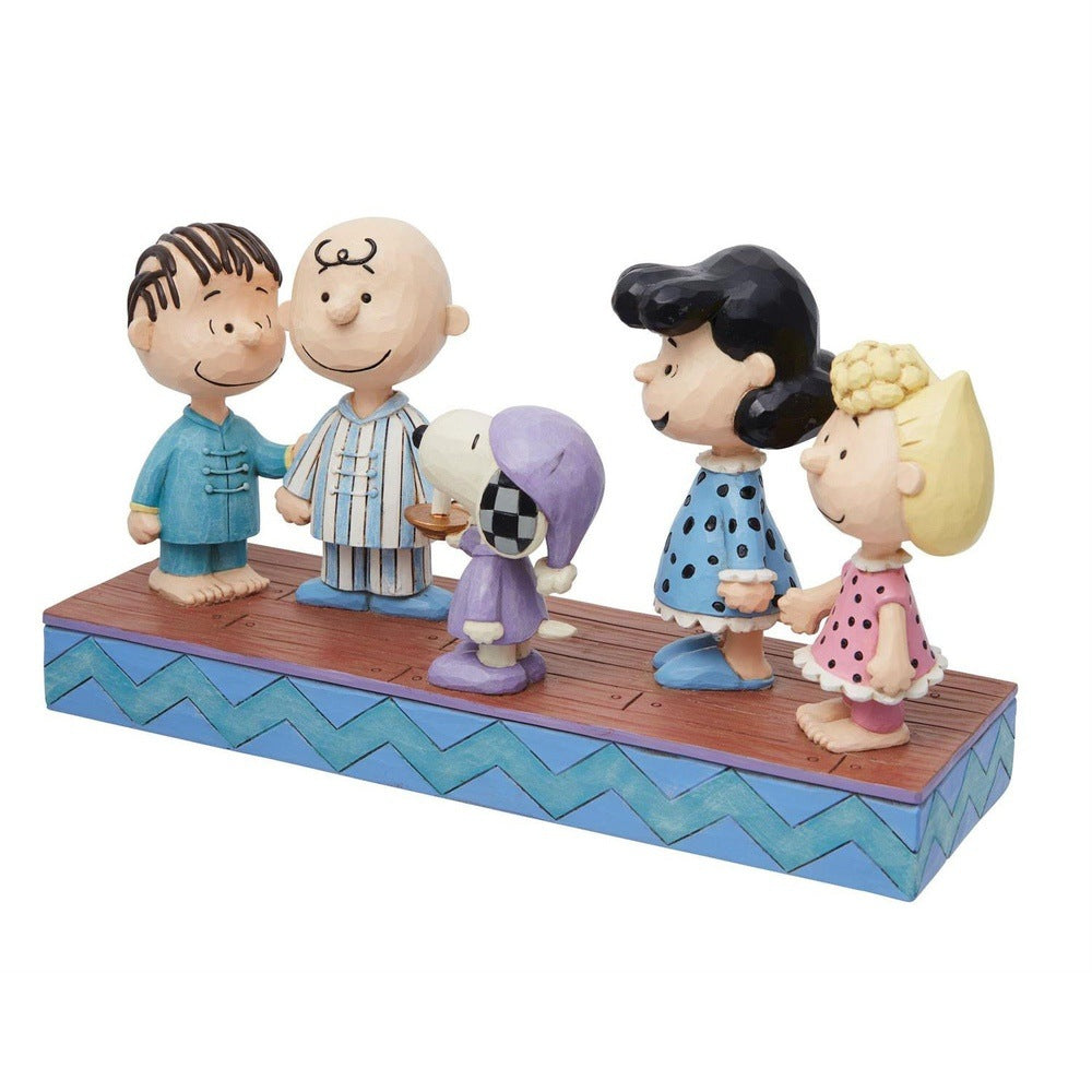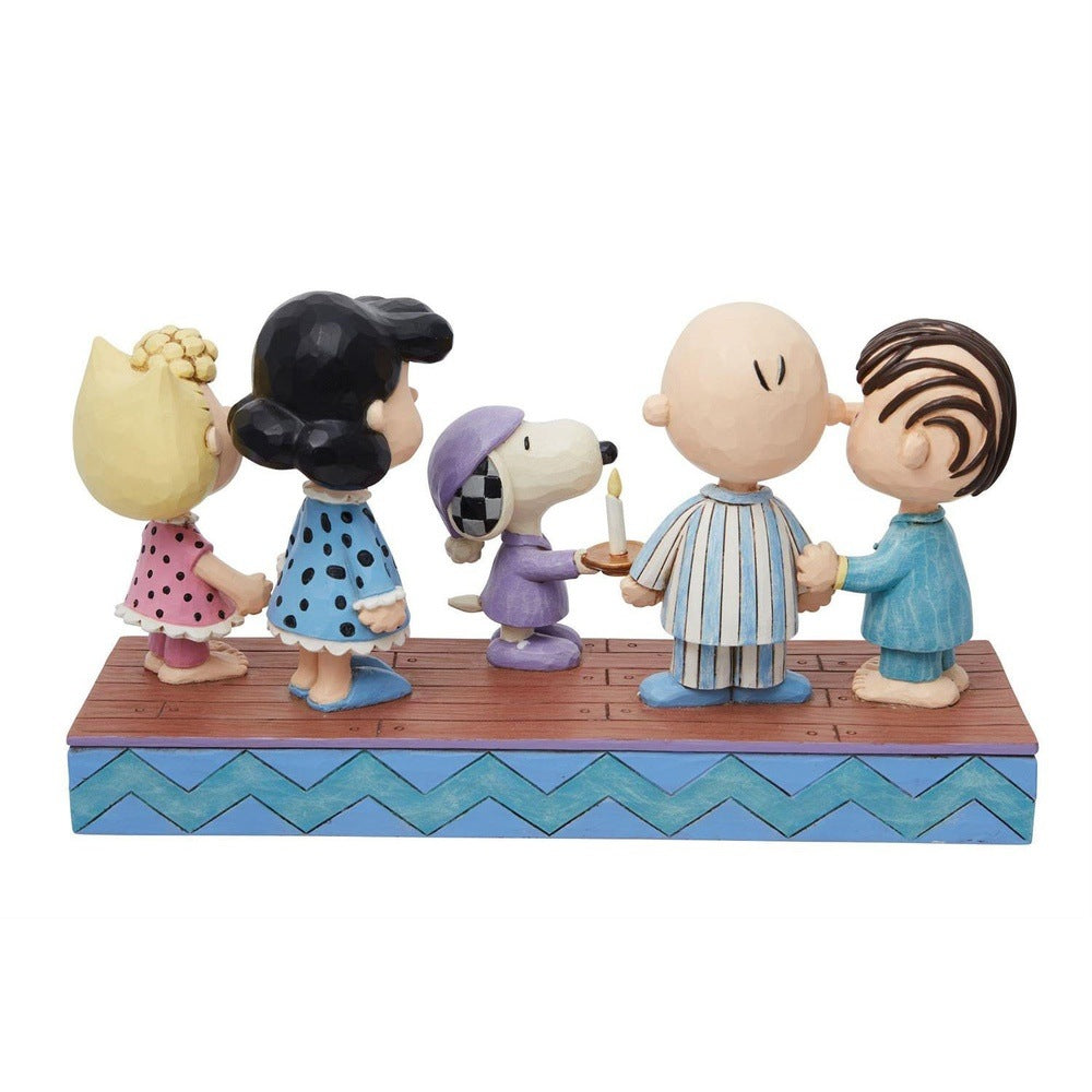 The Peanuts meet up at midnight to hatch a plan to catch Santa in this charming Jim Shore effigy of the beloved cartoon characters. Linus, Charlie Brown, Lucy, and Sally don their PJs while Snoopy carries a candle in his slippers and night cap.