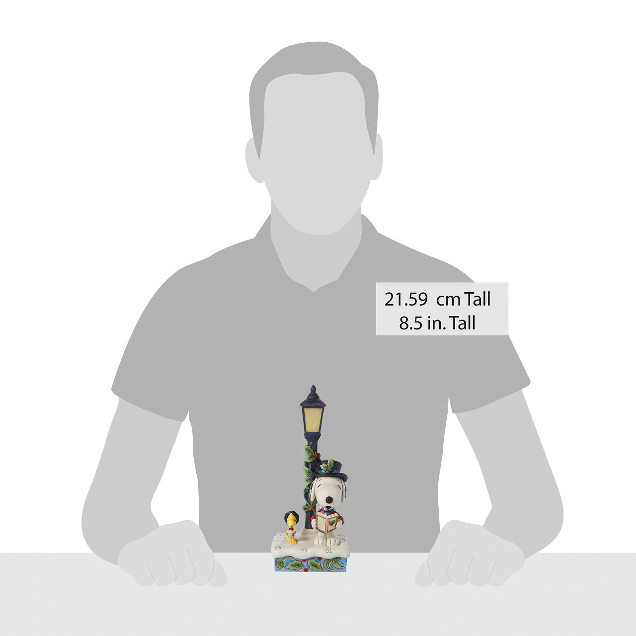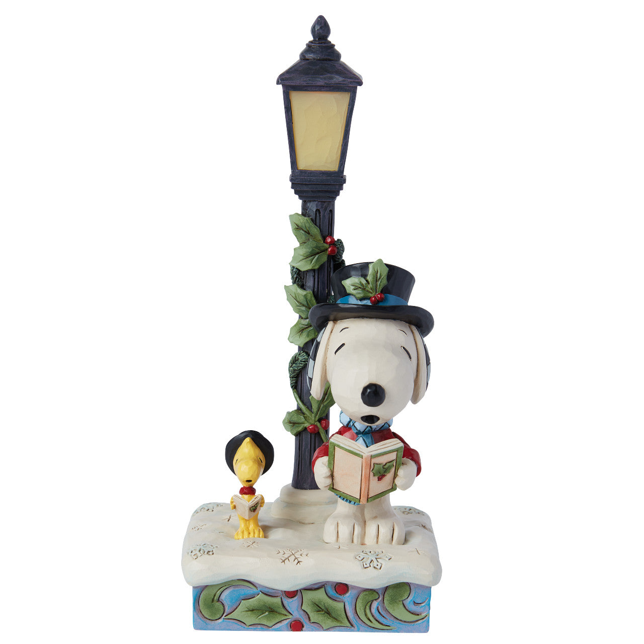 This festive creation from Jim Shore shares a classic holiday caroling scene set in the snow. Singing beside a light up lamp post decorated with garland and mistletoe, Woodstock and Snoopy spread Christmas spirit with song and style.