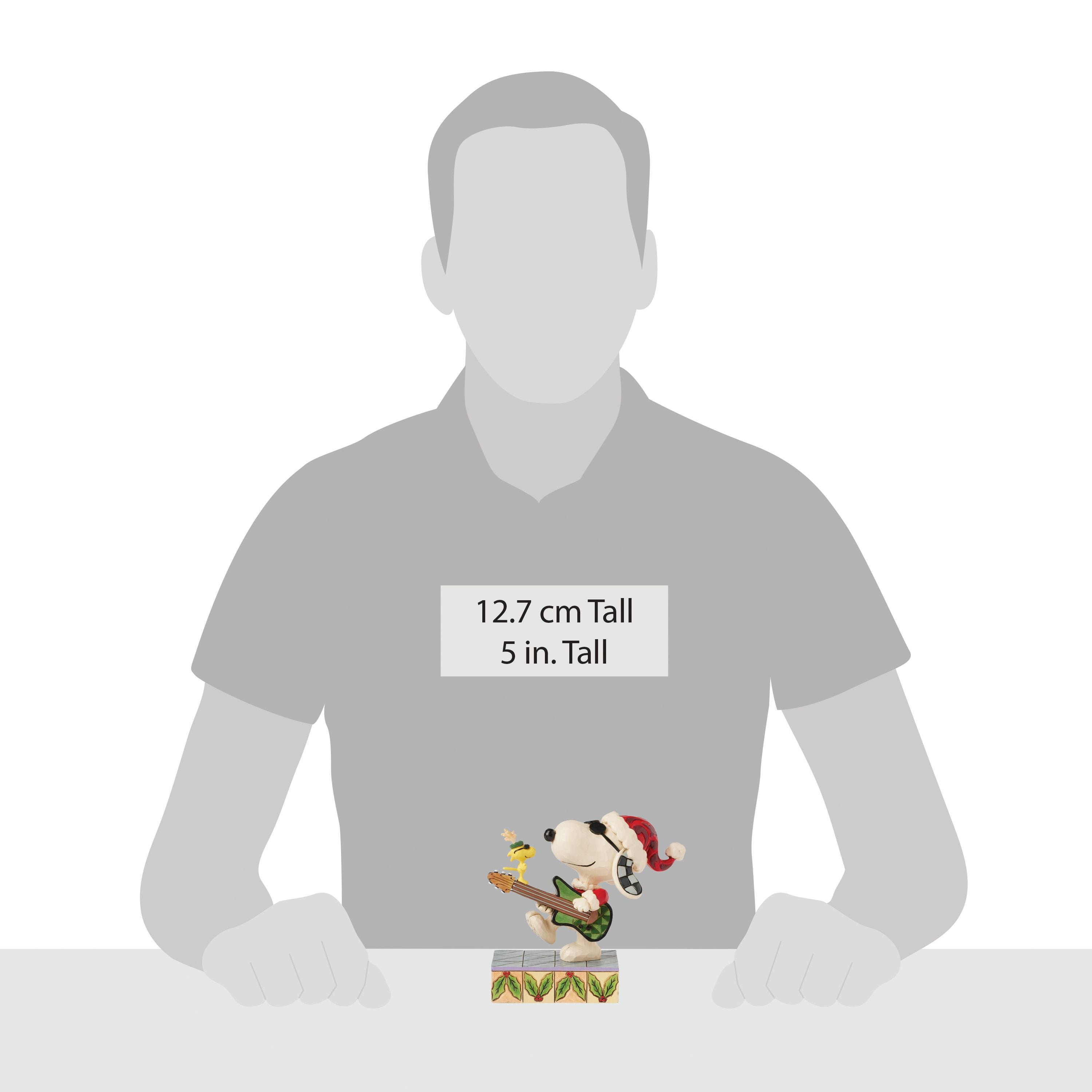 Rock around the Christmas tree with this lively Jim Shore design of Snoopy and Woodstock in full holiday groove. Snoopy sports a Santa hat and sunglasses as he strums an electric guitar coolly, while Woodstock enjoys the show with reindeer antlers.