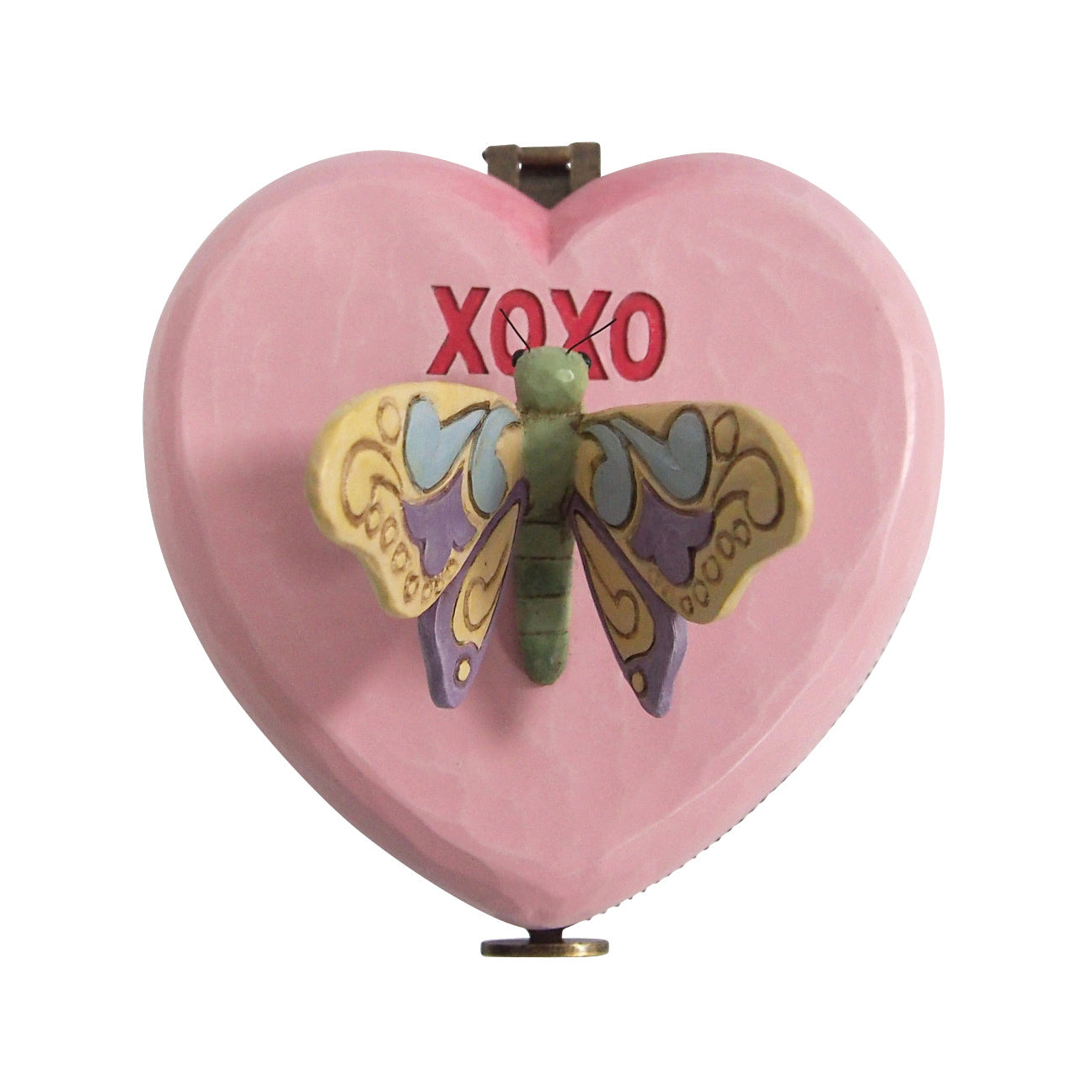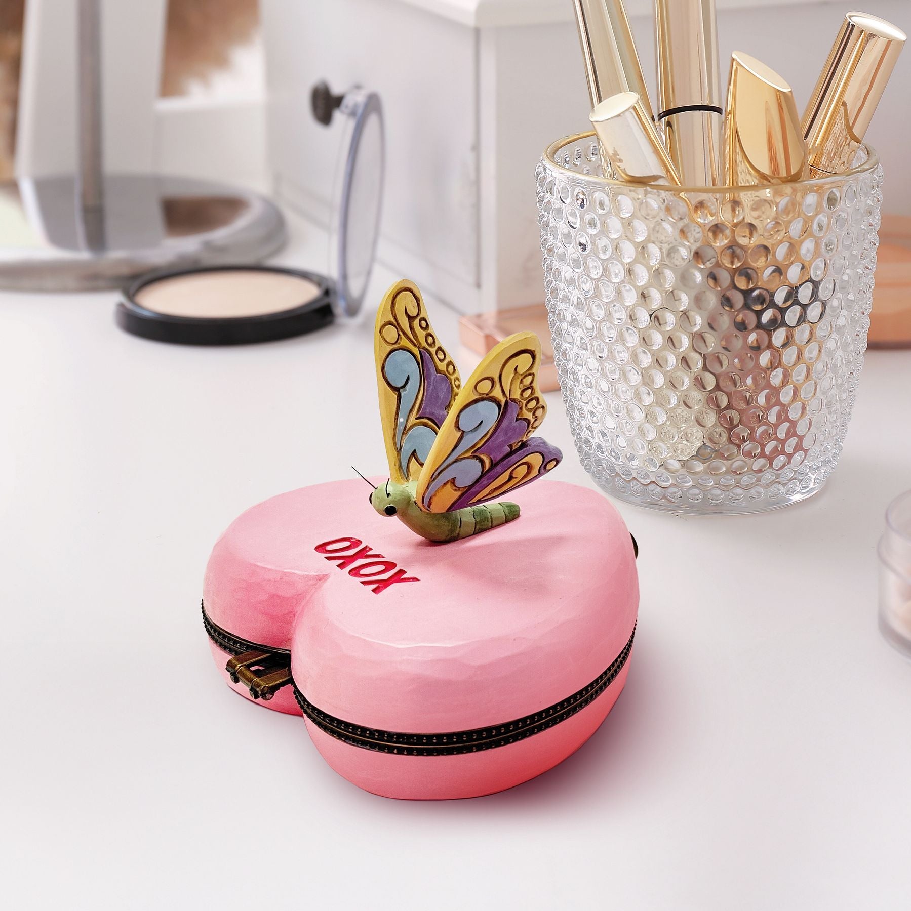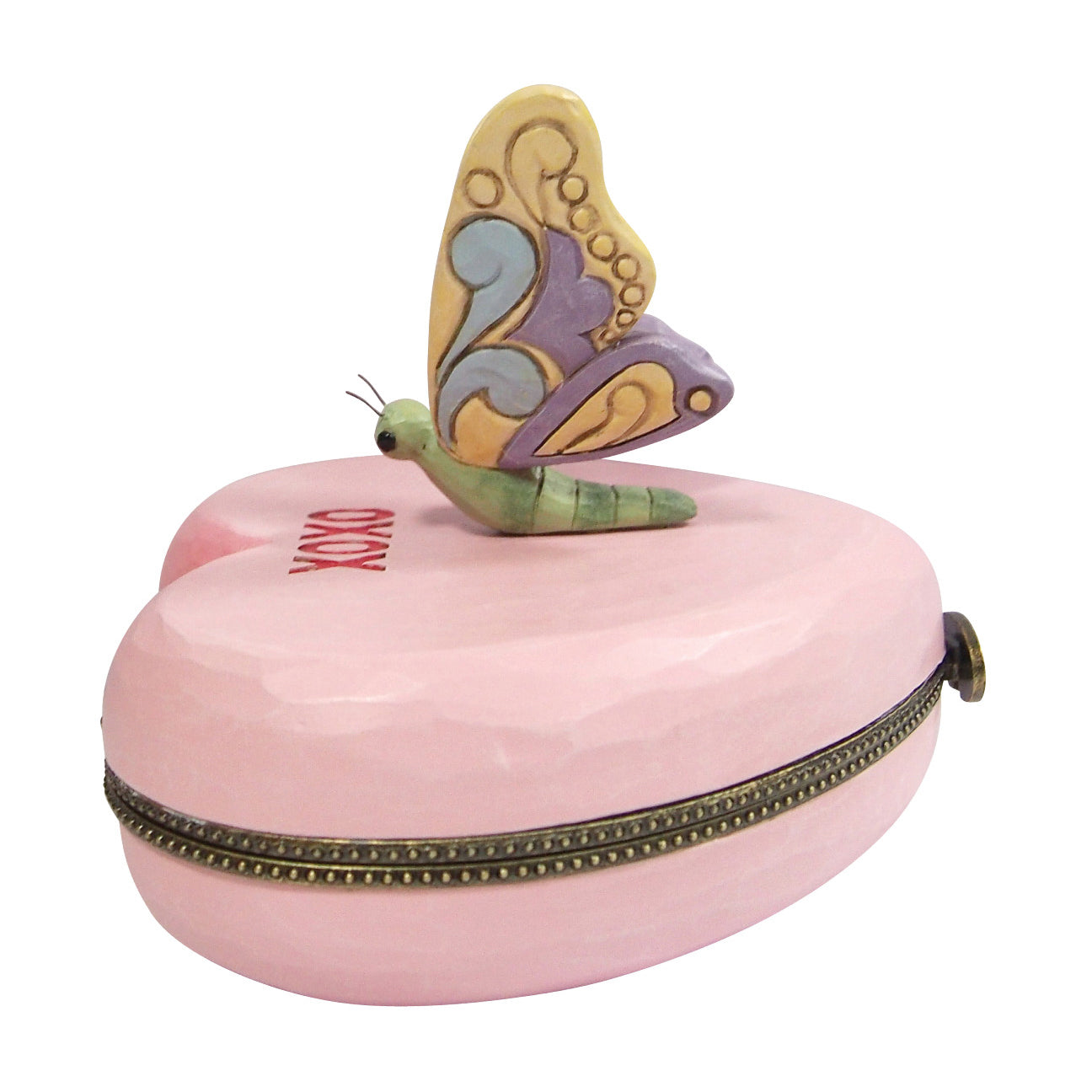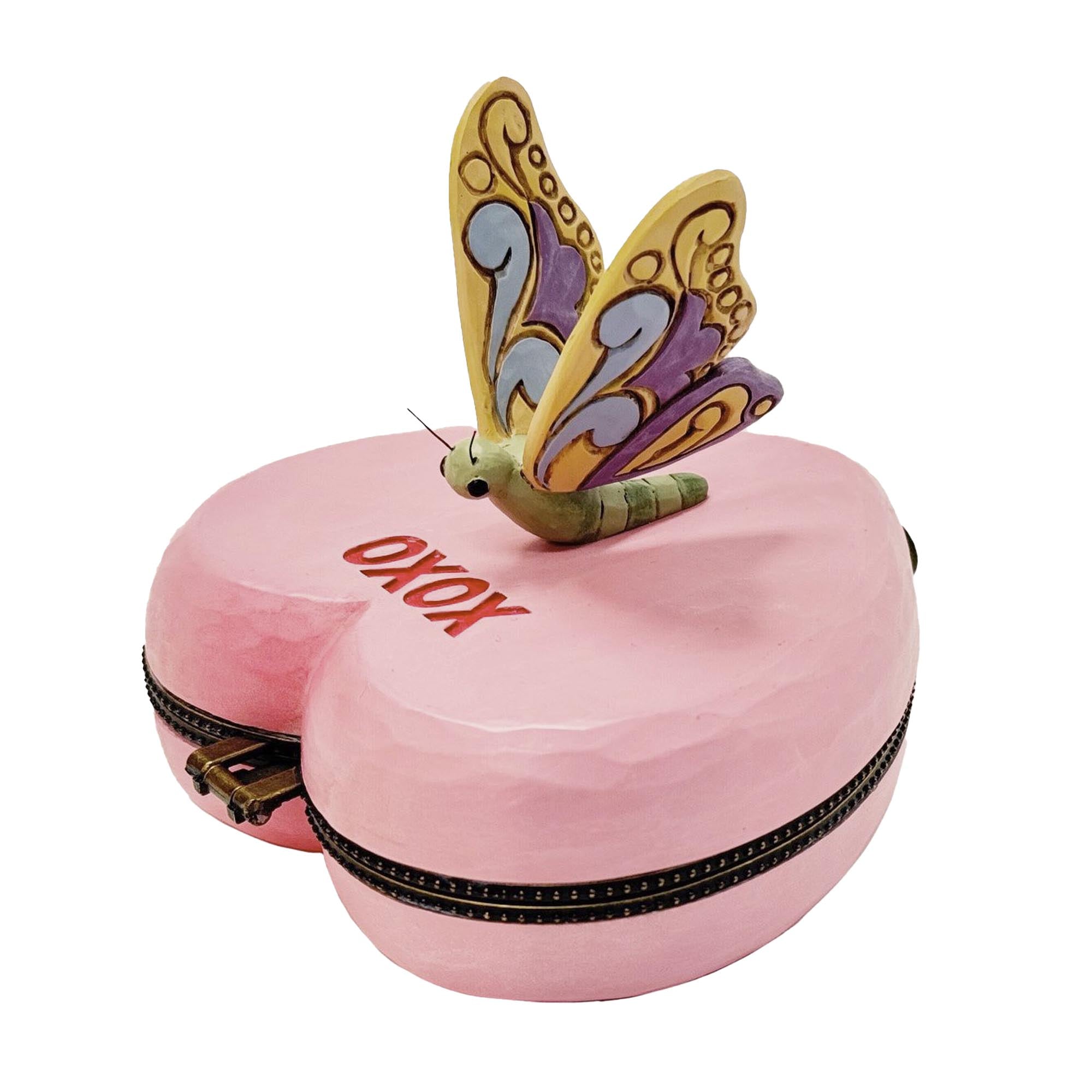 Crafted by Jim Shore, this stunning trinket box figurine takes the form of a pink candy heart, adorned with a beautiful butterfly boasting vibrant wings and colors. From its delicate perch, it whispers a timeless truth: Love is the sweetest nectar of life.
