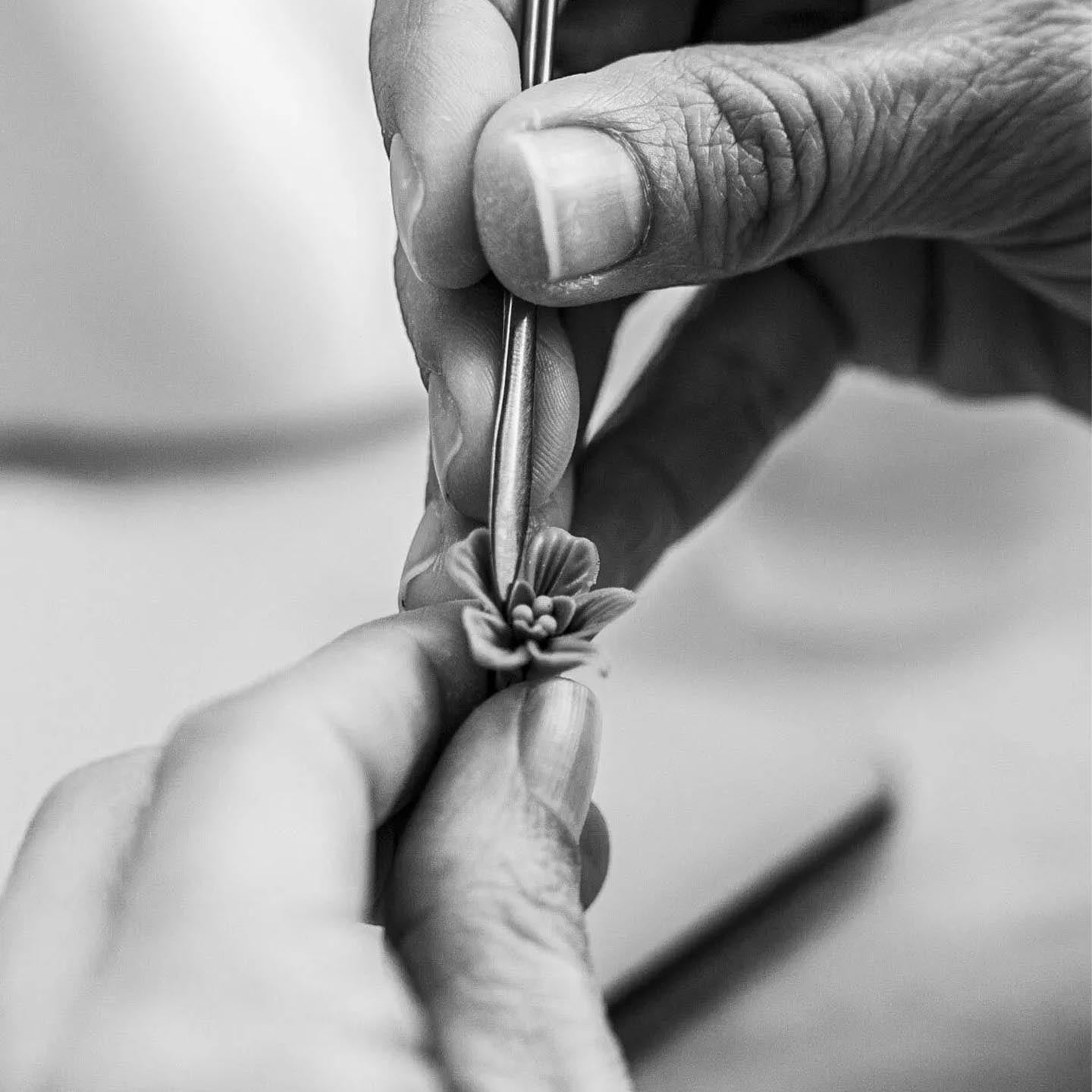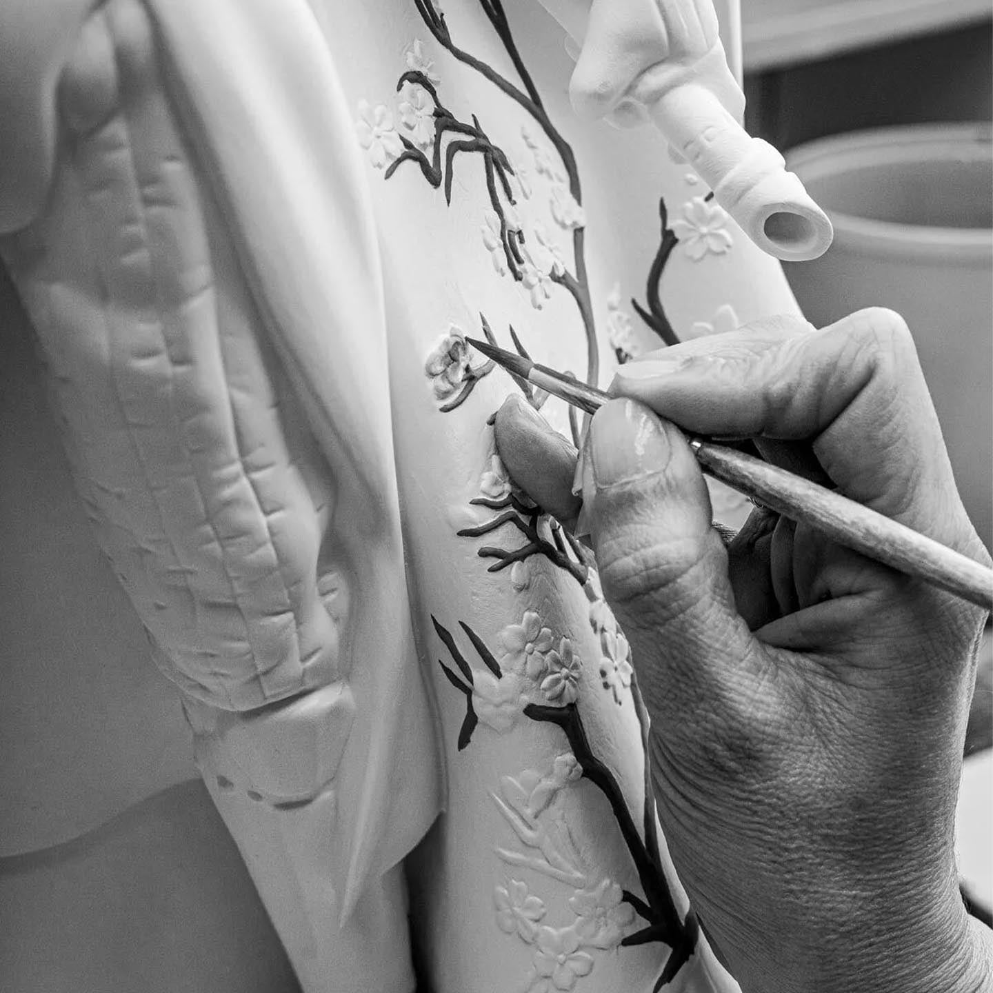 Handcrafted in pure white porcelain, this edition stands out for its strikingly decorated cape. Inspired by the iconic cherry blossoms, its design features graphic black strokes that evoke tree branches, adorned with 80 delicate flowers. On the back, each blossom is meticulously handcrafted, petal by petal, while the front they are combined with others in bas-relief.