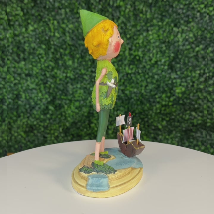 From the Peter Pan collection by Lori Mitchell. Peter is one boy who never wants to grow up, and in Neverland he never will. Standing atop a beach scene base with Captain Hook's ship anchored off the shore, he strikes a defiant pose. Wearing a leafy green shirt and shorts, with matching green cap over his tousled blond hair, his dagger is tucked neatly in his belt sheath.